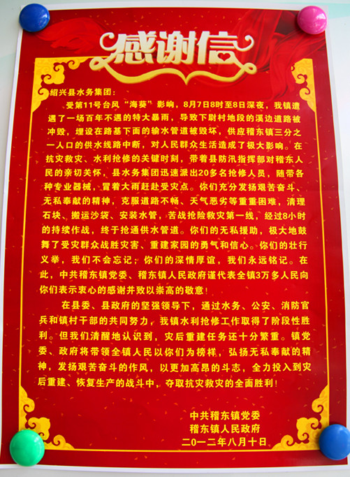 8月17日,中共稽東鎮黨委、稽東鎮人民政府專程為集團送來感謝信和錦旗,衷心感謝集團在第11號臺風“???rdquo;期間,發揚艱苦奮斗、無私奉獻精神,第一時間成功搶修被毀壞的輸水總管,保障了該鎮人民群眾的飲水安全。