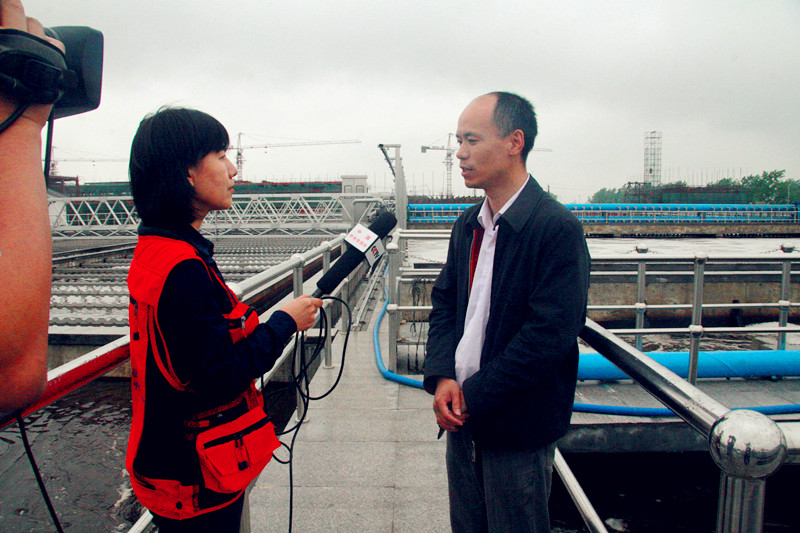 56,中央電視臺記者來到江濱水處理公司實地采訪紹興縣濱海印染產業集聚區印染企業污水集中預處理相關情況。采訪中,江濱水處理公司董事長王興亮就紹興縣印染產業集聚進度、印染污水集中處理與傳統處理方法的區別與優勢等問題作了深入淺出的分析。