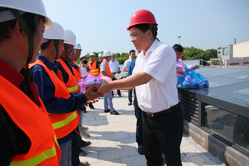 圖為集團(tuán)黨委書記、董事長(zhǎng)周儉慰問(wèn)紹興水處理公司脫氮工程施工人員