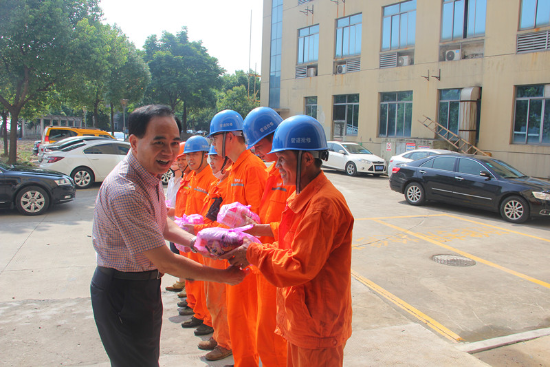 圖為集團(tuán)黨委副書記、總經(jīng)理單寶子慰問(wèn)排水公司養(yǎng)護(hù)班組工作人員