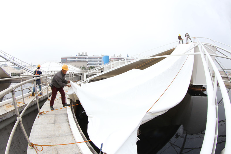 日前,江濱水處理公司20萬噸/日集中預處理二期工程污泥濃縮池進入鋼結構膜安裝階段,預計于本月底基本完成。該除臭系統由8個鋼結構反吊膜裝置及2個生物除臭裝置組成,為公司第四批建設的除臭項目。至此,公司在臭氣治理上已累計投入2000余萬元,目前廠區內高、中濃度臭氣基本實現全收集、全治理,為實現“生態江濱”目標打下了堅實基礎。