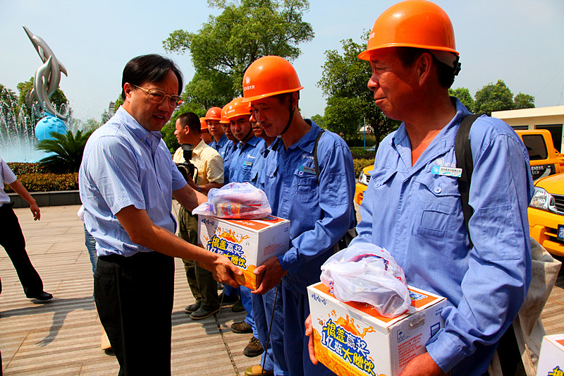 7月12日上午,縣委書記何加順、副縣長周樹森等領(lǐng)導(dǎo)在水務(wù)集團(tuán)董事長倪阿泉、總經(jīng)理單寶子等領(lǐng)導(dǎo)陪同下來到公司慰問在高溫下作業(yè)的供水一線職工,親手把防暑降溫慰問品送到他們手上,并再三叮囑有關(guān)人員落實(shí)好夏季高溫時段的防暑降溫措施,確保一線職工身體健康。