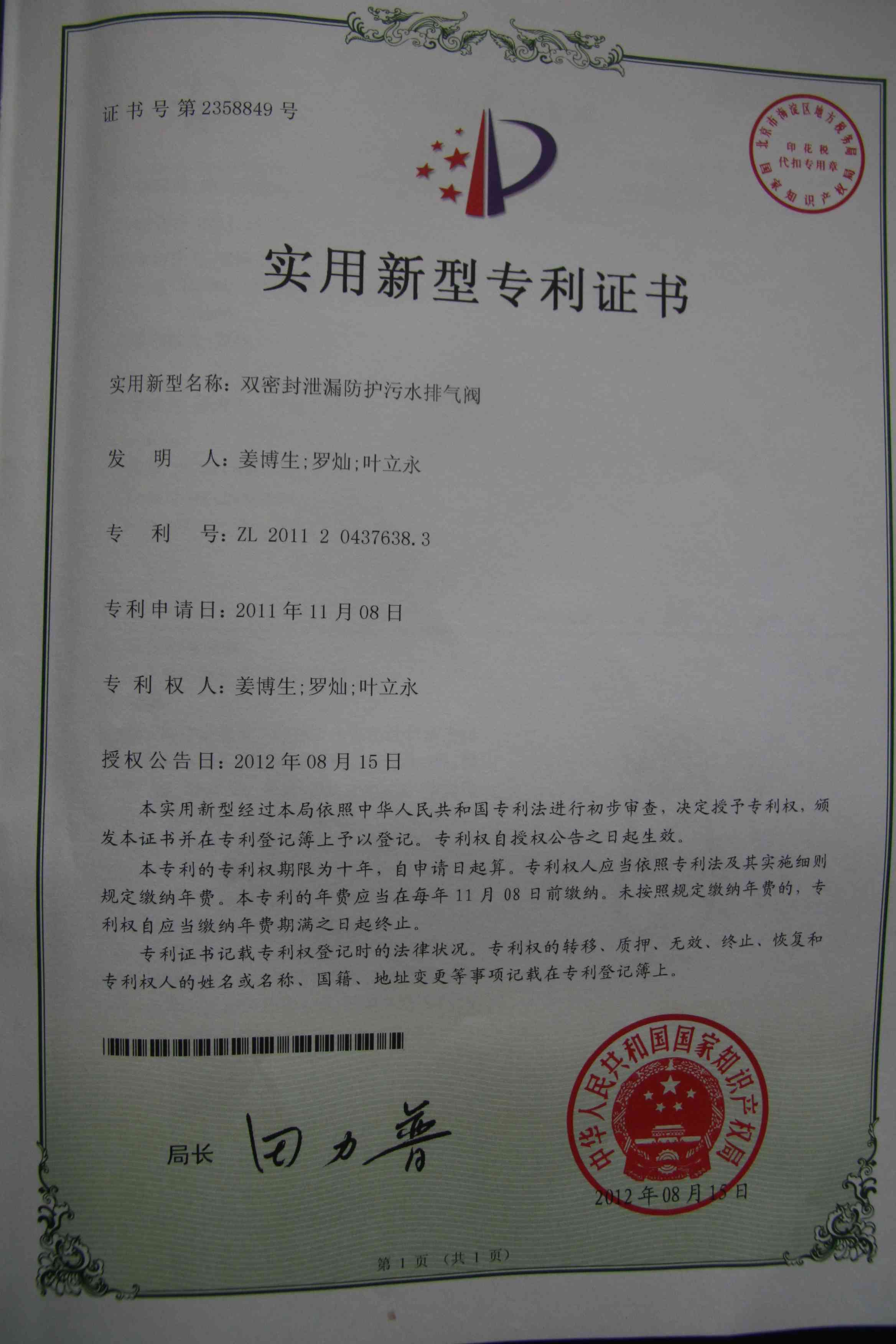 《雙密封泄漏防護(hù)污水排氣閥》獲國家級(jí)實(shí)用新型專利