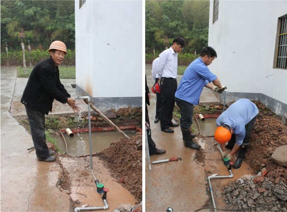 為盡快幫助村民解決用水問題,安裝小組冒雨前往。在安裝現(xiàn)場(chǎng),我們看到有人在使用套絲機(jī),有人在接水管,大伙忙的不亦樂乎。經(jīng)過2個(gè)小時(shí)的奮戰(zhàn),順利為其接通水源,安好水表,并裝好了水龍頭。當(dāng)現(xiàn)場(chǎng)看到水龍頭流出水的那瞬間,大家的心情都非常激動(dòng),費(fèi)某的臉上更露出了久違的笑容,欣喜的用手接起了新家的“第一股清泉”。